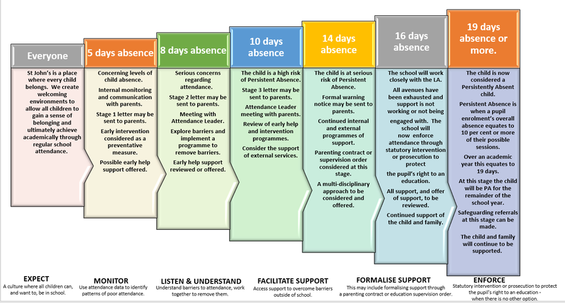 St John's Primary school records details of all children’s attendance and absence at school. We must do so at the beginning of morning and afternoon sessions. If your child is absent, you must tell the school why immediately. The school will record the absence; the Local Authority will receive this information for each child. The Department of Education also receives annual attendance data for the school.