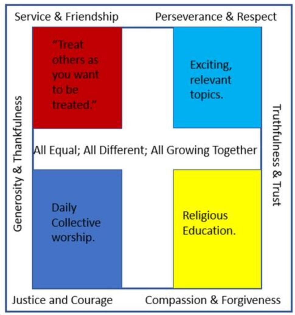 Opportunities are planned for PSHE, SMSC, British Values and RE to be integral to all topics. Values are central to the curriculum, cementing the different aspects of school life together. Values link Collective Worship and RE to the topics and bring our ethos into all learning. Pupils consider the impact that values such as compassion and forgiveness have had on events on both the world stage (eg WW2), and at a personal level e.g. the impact of bullying. Topics have been organised so that all children will be learning about the same two values at the same time. This enables children to have a common theme in their learning life, even though they will be studying different subjects and topics; building cohesion across the school.