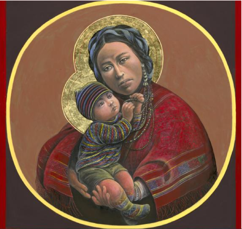 This artist grew up in America but his parents were Italian immigrants. He is a Catholic priest as well as an artist. Because of background, he says that the country you come from or your parents come from can often be seen as your spiritual home. In his art he wants to show this spirituality by painting people who are indigenous (country of origin) as saints or religious people. This painting is of a mother and child from Guatemala. Guatemala is in Central America and the largest population there is the Mayan community, (If you learnt about ‘Does chocolate grow on trees’ when you were in Year 2 you will have found out all about the Mayan people).