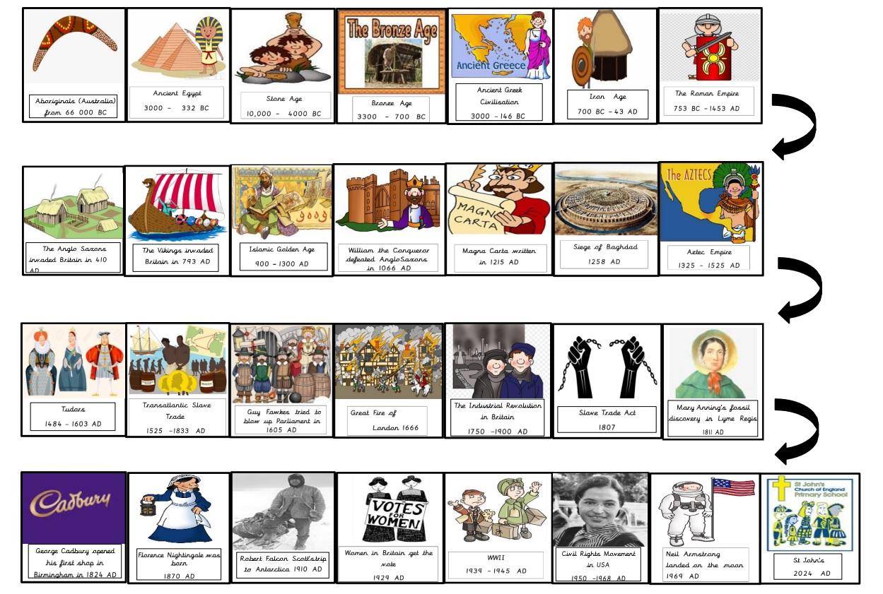 As we study history, we build knowledge of significant people, periods and events chronologically. We can see this through our St John timeline. New periods, people and periods are added with every year group. Children can then connect learning from different year groups and understand how the history school curriculum fits together. An example of this progression can be seen in the study of Tudors. The period is introduced in Year 1 as the children learn about Guy Fawkes in Whizz, Bang Pop. Knowledge of this period is then developed as Year 2 discovers the Great Fire of London (Fire Fighters) in 1666. In Year 5, children recall knowledge of Year 1 and Year 2 learning as they study Shakespeare and the Tudors in more depth in All the Word's a Stage.