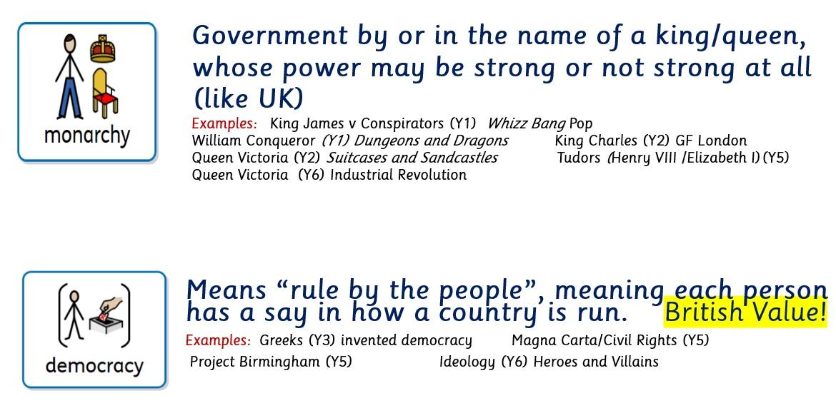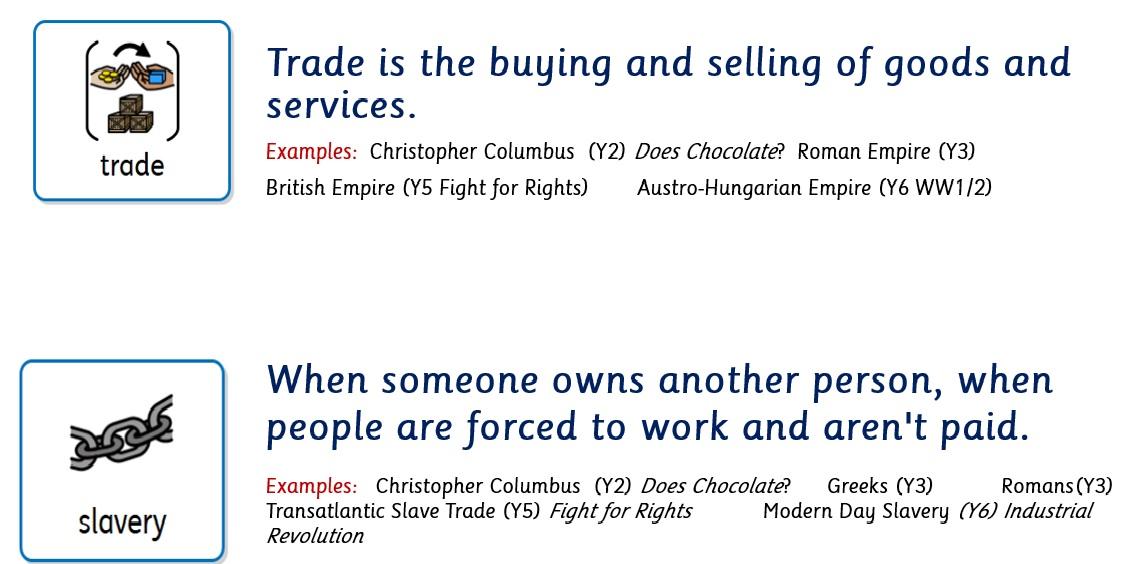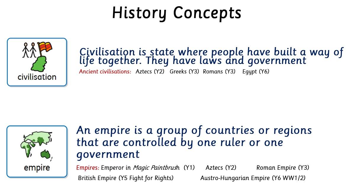 Central to our history curriculum is a focus on historical vocabulary and terms to understand events and people. Some of these are abstract terms which are woven through from Early Years to Year 6 and revisited e.g. trade, civilisation, empire, democracy. In this way, staff are committed to helping children build meaningful schemata, by linking prior knowledge with new learning.