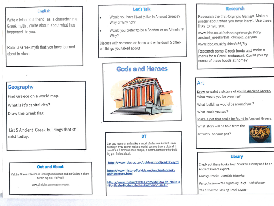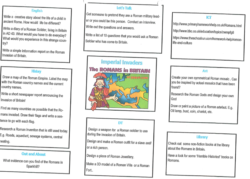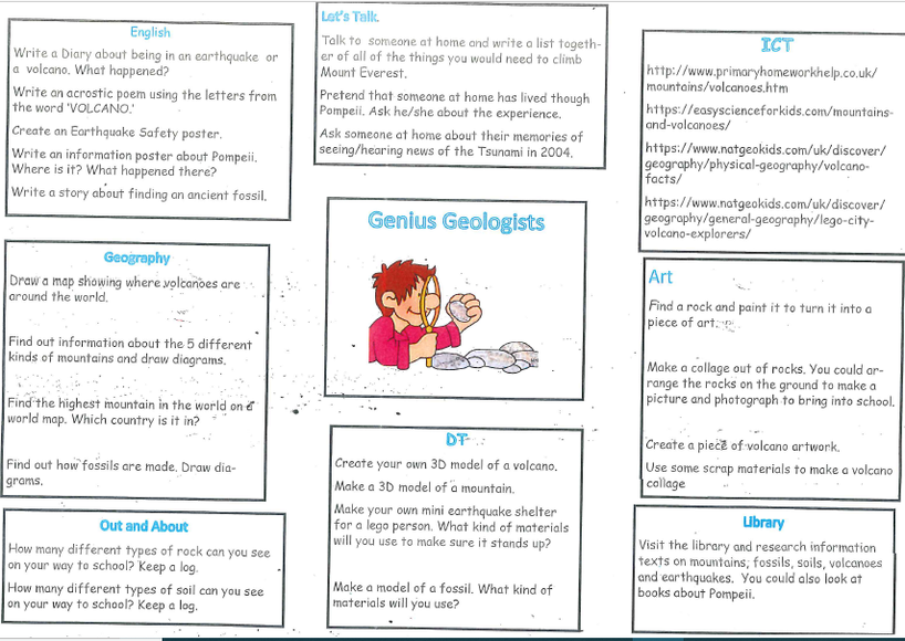 For each topic we cover in school, choose from activities on the map (see below). Your child should complete each task in this book (1 task per week). He/she can use the Knowledge Organiser for the topic to help.