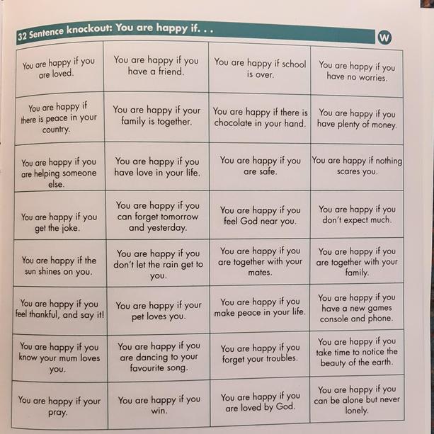 Over the next few weeks we're looking at what it means to be happy. Start by reading the sentences on the picture below. Choose the 5 ones you think are most important and explain why.