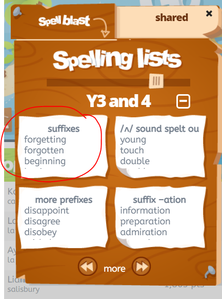 Log onto the BGFL. On the grid/squares page click on the J2blast square. Click on Spelling blast, choose have a practice. Move the toggle until it says Yr 3 and 4 and then click on the +.