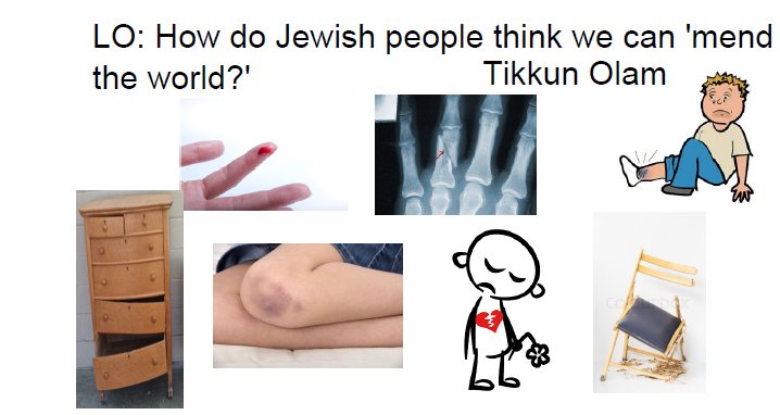 Tikkun Olam means 'repairing the world' . Jewish people believe that we can do things to help repair the world, to make it a better place.