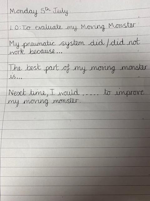 We would like you to write an evaluation of your model. In your books, copy the date and LO. Write the sentences and finish them off with your ideas. In the first sentence, choose whether you need to write 'did' or 'did not'. This will depend on if your pneumatic system worked or not!