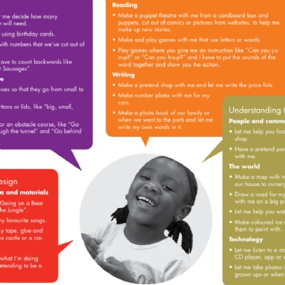 Children learn and develop through playing, exploring, being active, creative and being asked questions to help their thinking. The documents below give you some examples, ideas and tips as to how you can help your child’s learning and development. We hope this will help you to know how your child is developing by highlighting what to expect, remembering that all children are different. Use it as a prompt to explore and try new things together.